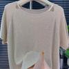 חולצת טי קיצית לנשים מסאטן, צווארון עגול, שרוולים קצרים, גזרה רפויה