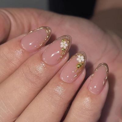 לוחות ציפורניים קצרים בסגנון קט-איי זהב צרפתי 24 טלאי ציפורניים מוכנים ציפורניים בצורת שקד לוחות אמנות ציפורניים אירופה ואמריקה
