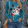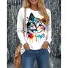 חולצות טי לנשים עם שרוולים ארוכים, צווארון עגול, הדפס גרפי צבעוני של חתול בתלת מימד, אופנתיות וקז'ואליות, מתאימות לאביב ולסתיו