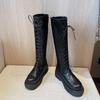Women's Black Leather Thigh-High Lace-Up Platform Boots - Over-the-Knee, Height-Enhancing, Riding Martin Style