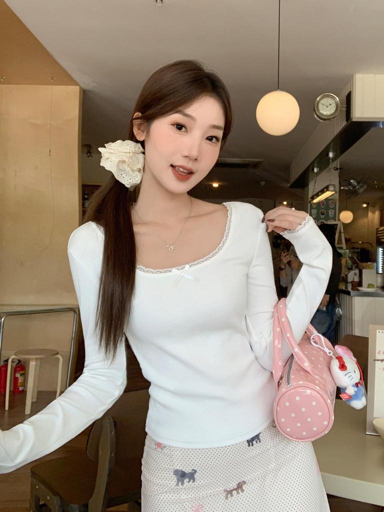 Bow Lace Spliced Sexy Long Sleeve Square Neck T-shirt for Women - 2025 Early Autumn Edition