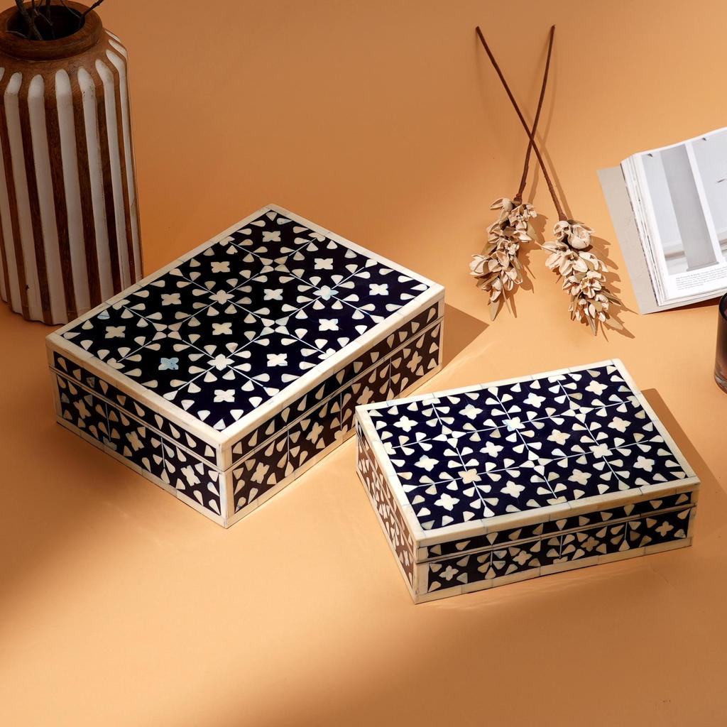 Bring elegance and artisanal charm to your home with our Floral Bone Inlay Box Set of 2. Handcrafted by skilled artisans, each box showcases an intricate floral pattern made from ethically sourced bone and resin, beautifully set on a durable MDF base.