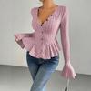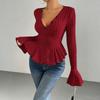 חולצת טי עליונה לנשים, צווארון וי, עם קפלונים, צבע אחיד, שרוולים ארוכים