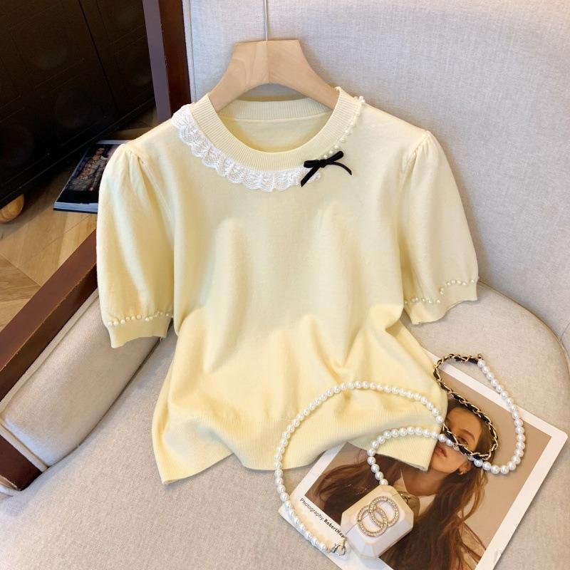 Lace Bow Short Sleeve Knitted Sweater Women's Summer Premium Bead Splicing Shoulder Top