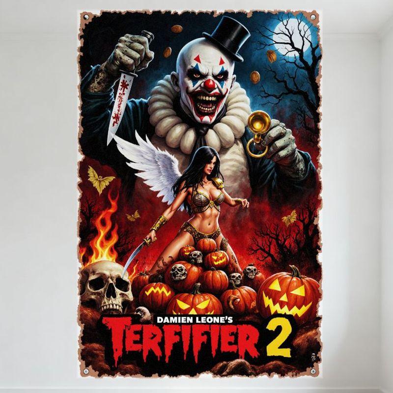 Terrifier 2 Horror Movie Tin Sign - Menacing Clown & Fierce Woman Art, Vintage Metal Plaque for Home/Bar/Cafe Decor