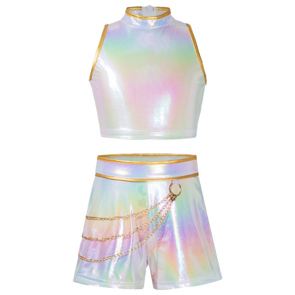 תלבושת משחק תפקידים של ציידת האנטר לבנות, תחפושות למסיבת קוספליי לליל כל הקדושים, גופיית טנק ללא שרוולים מבריקה מטאלית, חגורה, שרשרת מותן, מכנסיים קצרים