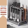 This modern kitchen countertop organizer provides convenient storage for your knives and kitchen utensils. Featuring a sleek gunmetal grey design, it includes dedicated slots for knives, double chopstick holders, and a cutting board rack. Its versatile no-drill installation option makes it a practical and stylish addition to any kitchen.
