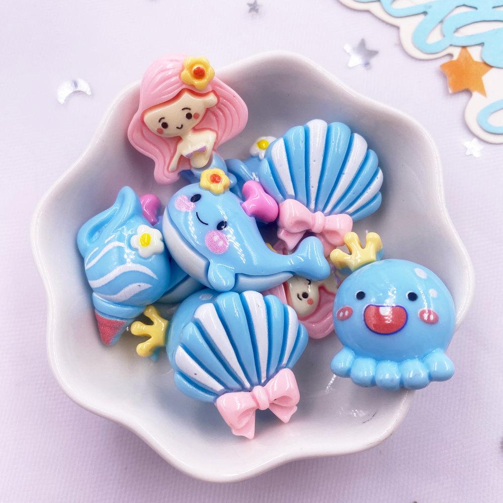 10pcs Colorful Resin Cartoon Mermaid Octopus Shell Conch Dolphin Figurines Flat back Scrapbook Hair Bow Decor DIY Jewelry Crafts