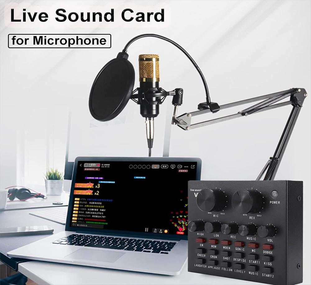 כרטיס קול V8 לשידור חי KTV, כרטיס קול כפול לטלפון נייד, מתאים לטלפון נייד, מחשב, כרטיס קול חיצוני (לבן שחור)