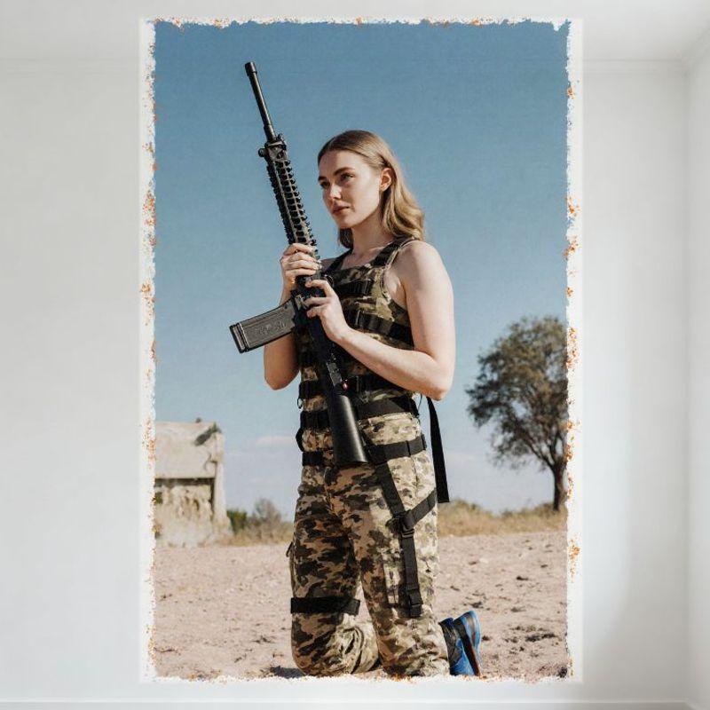 Sexy Blonde Woman in Camo Military Attire Kneeling with Rifle Desert Post-Apocalyptic Scene Tin Sign Metal Poster for Bar Pub Ho