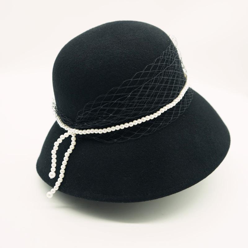 French Elegant Black Pearl Mesh Basin Hat Women'S Autumn And Winter Wool British Versatile Vintage Hepburn Fisherman Hat