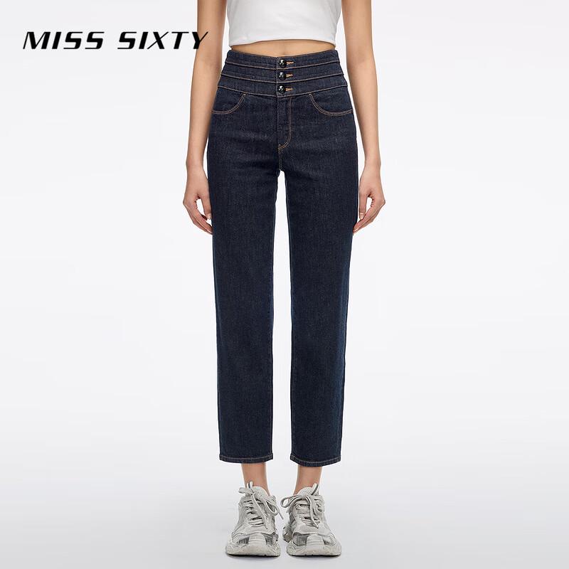 Experience the MISS SIXTY 2026 Spring collection with these high-waisted, dark blue straight-leg jeans designed for a slimming effect on pear shapes. Featuring a distinctive three-ring cinched waist, these cropped jeans offer a regular thickness for comfortable wear. Made from a blend of 96.9% cotton, 1.5% polyester, and 1.6% spandex.