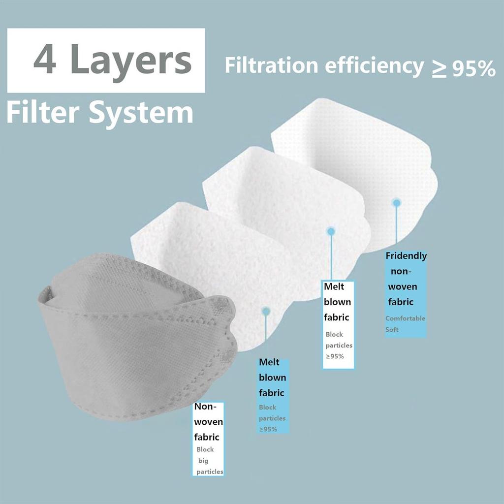 【HIGH GRAND QUALITY】 4 layers of material has high protection and high filtration efficiency. The outermost layer of non-woven fabric can filter large particles, the middle two layers of melt blown fabric can block more than 95% of particles, one layer of hot air cotton can filter PM2.5, and the innermost layer of non-woven fabric can Increase skin comfort