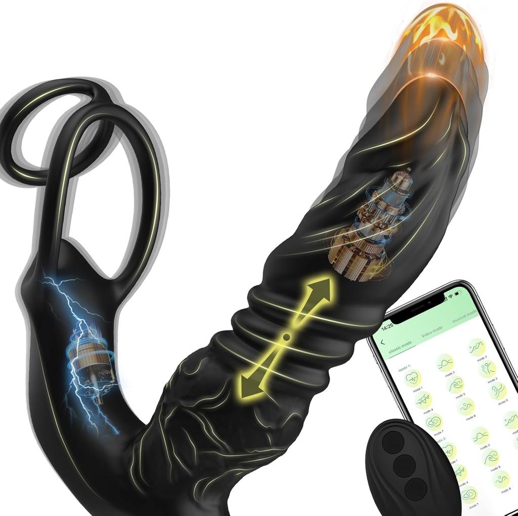 5-in-1 Prostate Massager Thrusting Anal Vibrator, Big Vibrating Anal Dildo Butt Plug with Dual Silicone Cock Ring, Male Sex Toy for Man Gay Couple