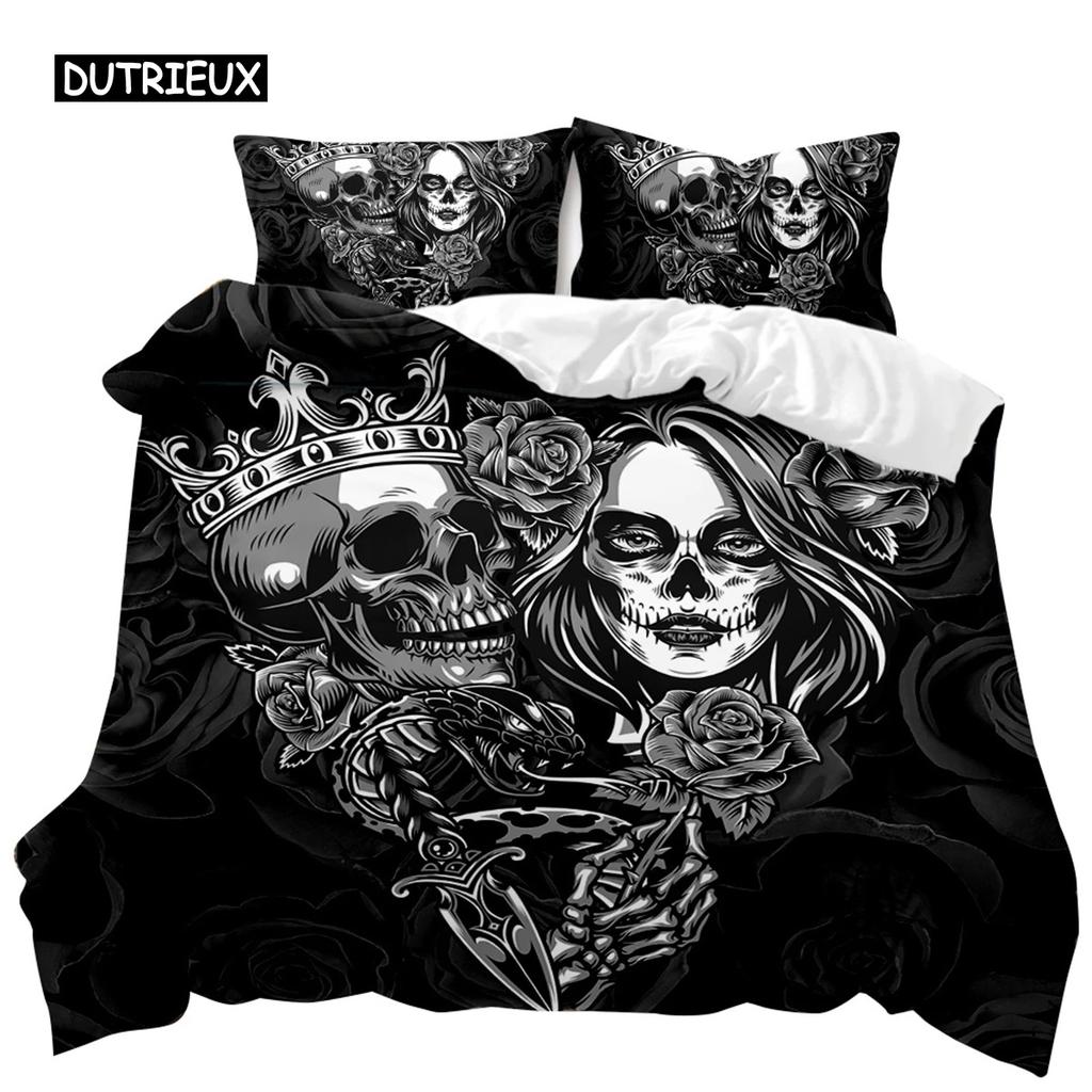 Skull Duvet Cover Set Rose Twin Skeleton Kiss Comforter Cover Teens Gothic Skeleton Double Queen King Size Polyester Qulit Cover