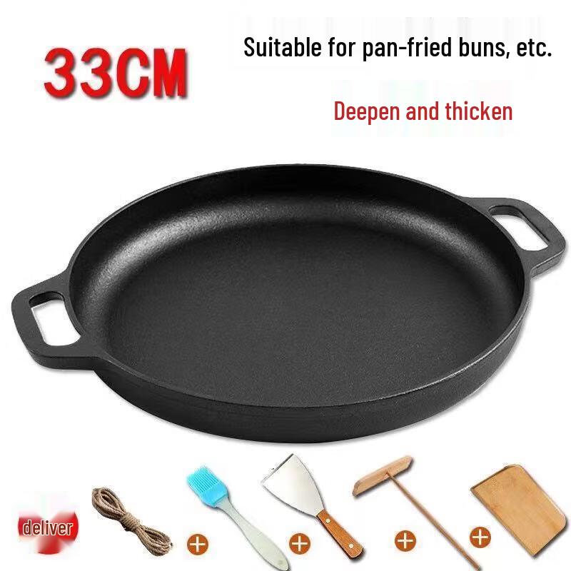 Experience versatile cooking with our Multi-Purpose Cast Iron Flat Pan & Griddle Set. Perfect for pizza, pancakes, stir-fries, and more. Crafted from durable cast iron, this deepened model ensures even heat distribution for consistent results. This set includes a 33cm flat baking pan and a convenient five-piece tool set for all your culinary needs.
