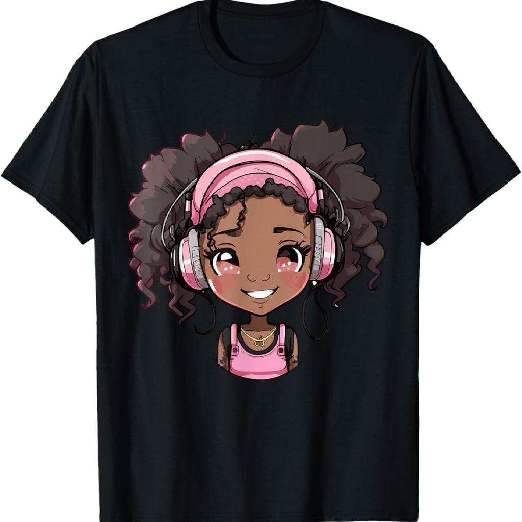 Anime and Music Black Girl Anime Merch Afro African American T-Shirt(9)