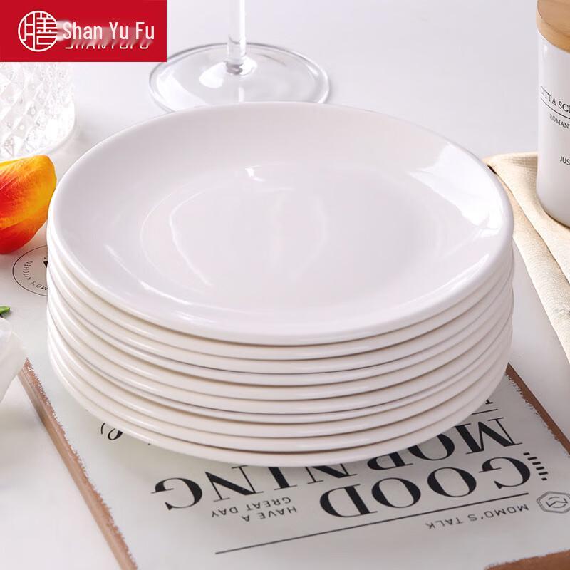 This set of Shanyufu pure white ceramic plates is versatile and suitable for serving salads, main courses, steaks, or fruits. Designed for both home and commercial use, these durable plates are perfect for hotels and restaurants.