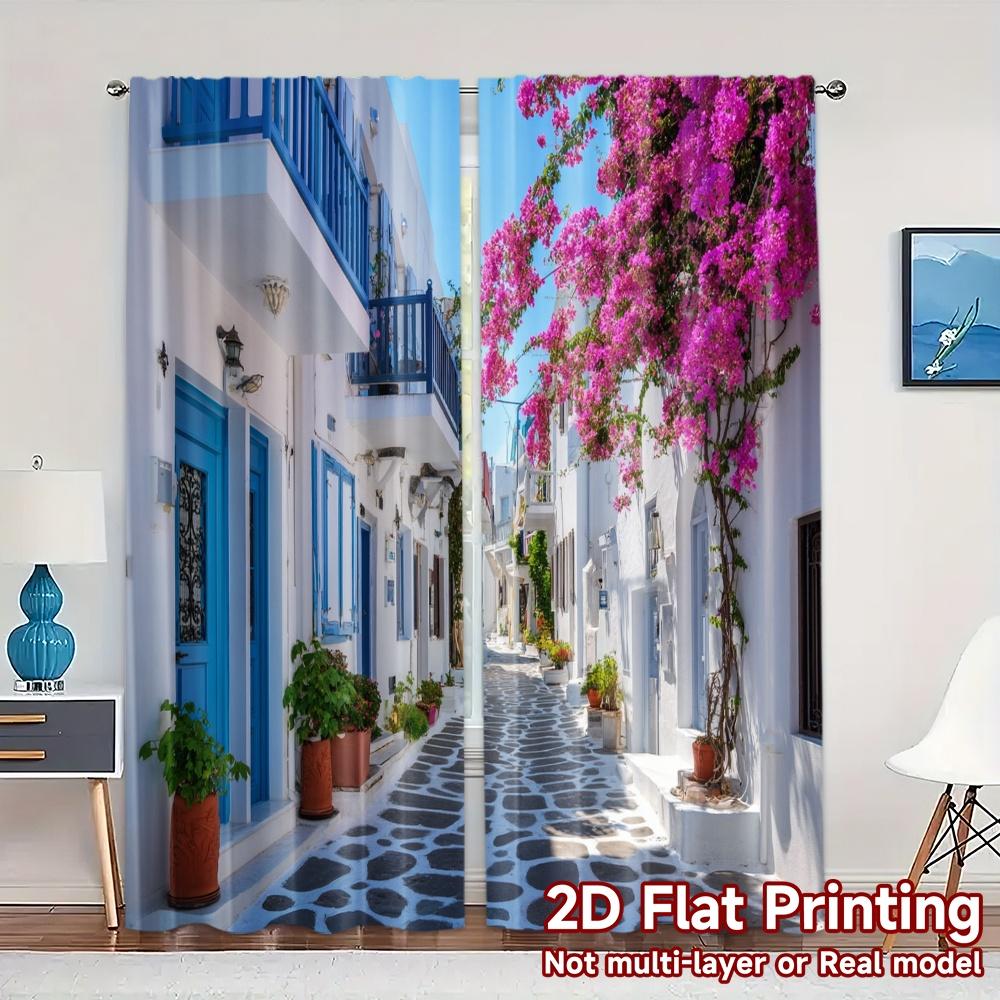 2pcs 2D FLAT PRINTING Curtains (Without Rod) Blue Bloom Street Popular Curtains Durable 100% Polyester Fabric Curtains Holiday
