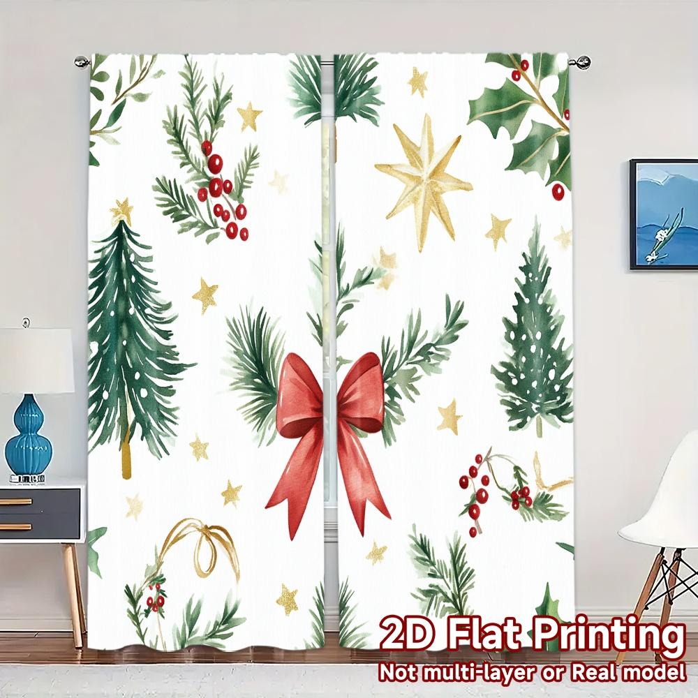 2pcs Curtains Christmas Bow Holly Berry Tree Fashionable Popular Curtains Durable Polyester Curtains Decorations Inside Use for