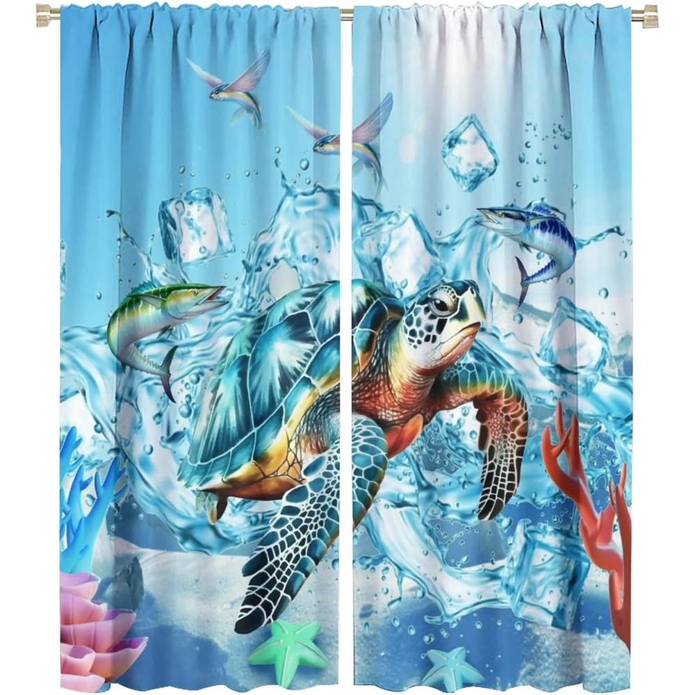 2 Panels Summer Beach Sea Turtle Blackout Thermal Insulated Room Darkening Curtains - Turquoise Blue Ocean Fish & Starfish Desig