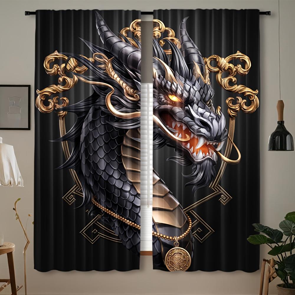 2pcs Bold Dragon Print Window Curtains - Black & Golden Dragon Window Drapes with Rod Pocket for Living Room Bedroom Kitchen -