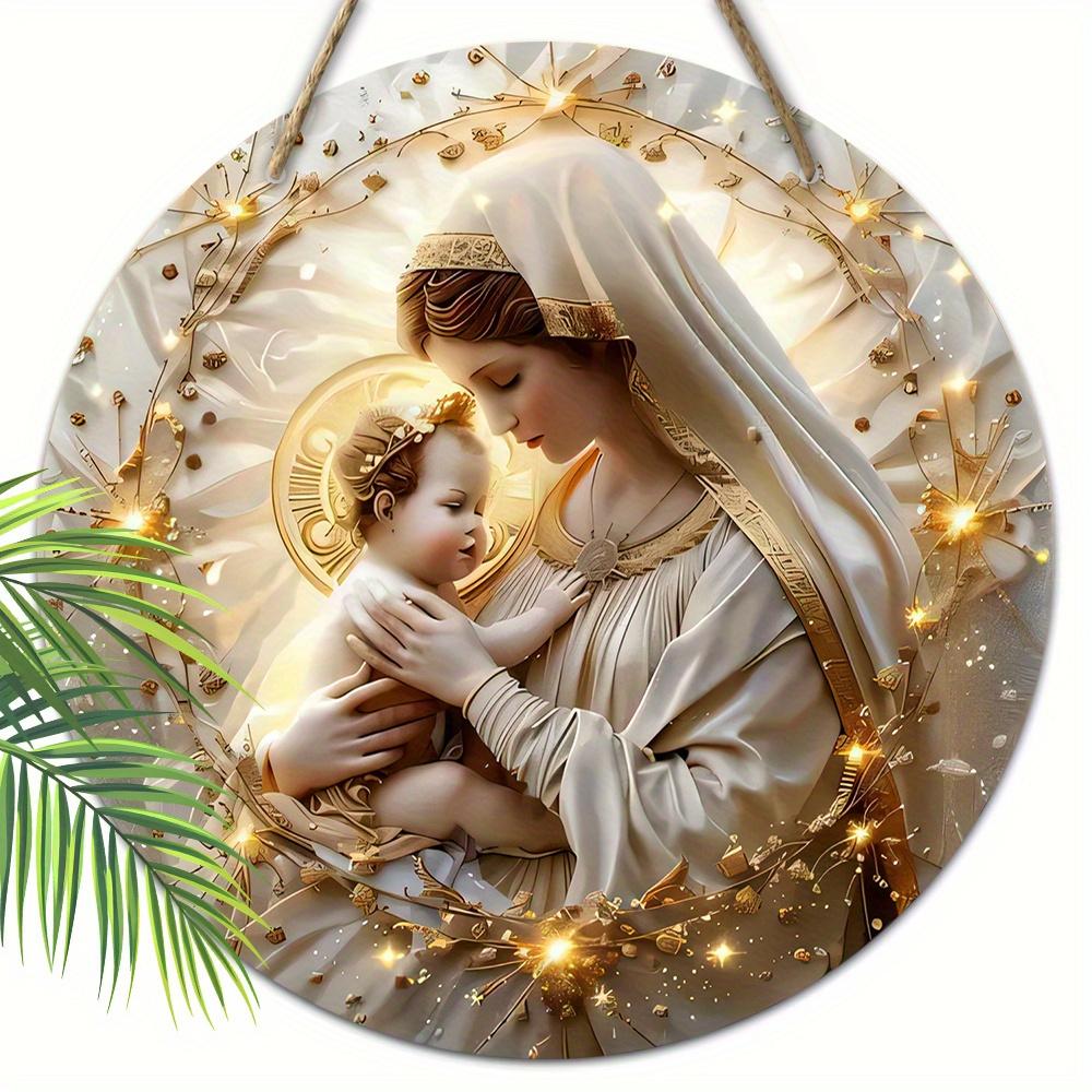 Virgin Mary & Jesus Wooden Sign, Round Front Door Decor, Golden Halo Religious Wall Hanging - Ideal for Christian Home & Church Decor