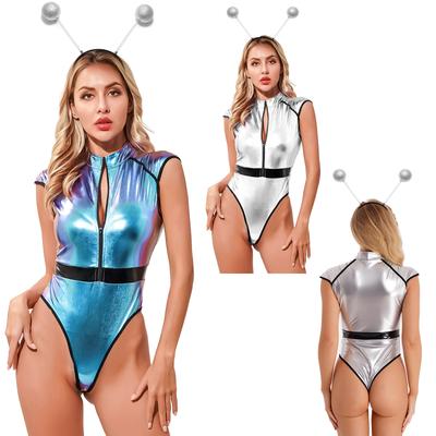תלבושות תלבושות משחק תפקידים לנשים בגד גוף מבריק מעור פטנט בגד גוף עם שרוולים מסיבת ריקודים על עמוד בגדי מועדון ליל כל הקדושים