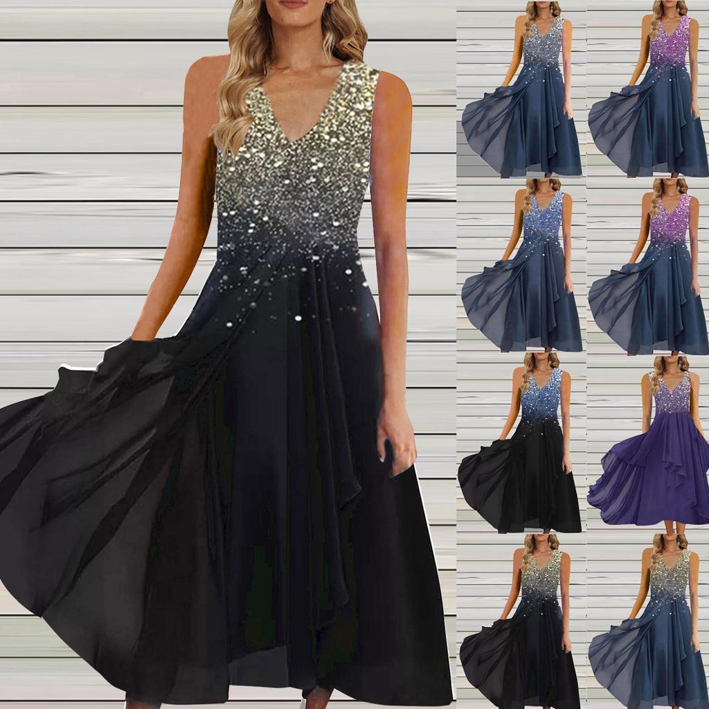 Women's Dress Chiffon Elegant Patchwork Dress Sleeveless Long Dress Evening Dress