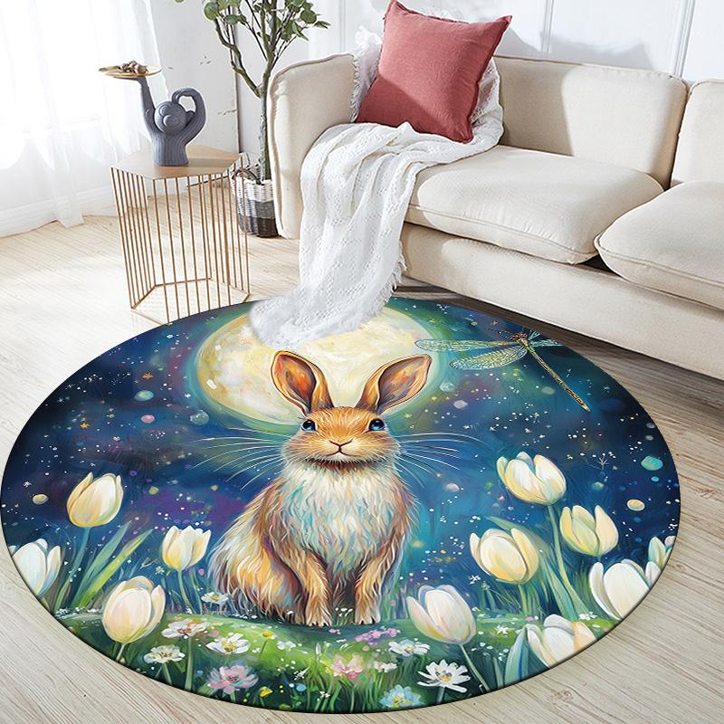 Flower Rabbit,Round Area Rug,Carpet Rug for Living Room Bedroom Sofa Playroom Decor,Non-slip Floor Mat