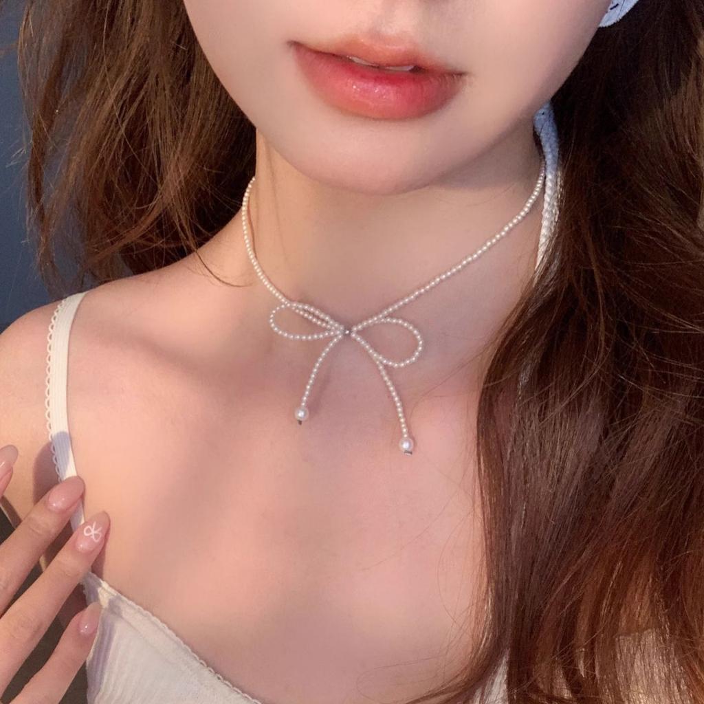 Super fairy bow pearl necklace fashion design collarbone chain colored stone light luxury Internet celebrity accessories neck chain