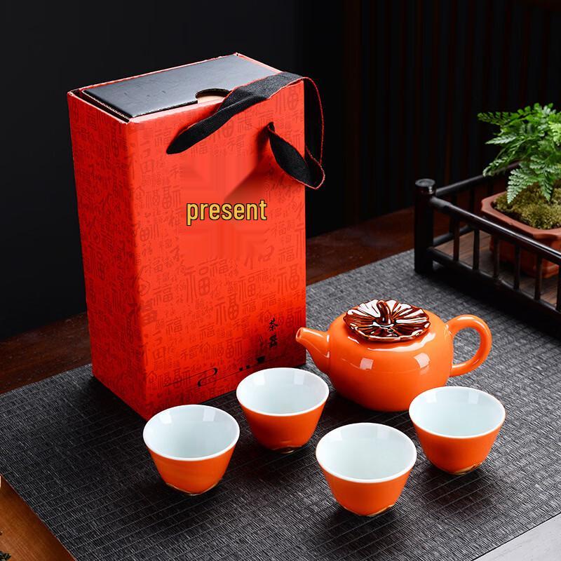 This elegant ceramic persimmon Kung Fu tea set comes in a beautiful gift box, making it a perfect souvenir or gift. It features a simple style and includes one pot and four ceramic cups.