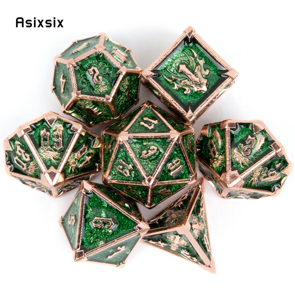 7 Pcs Green Golden Skull Metal Dice Solid Metal Polyhedral Dice Set Suitable for Role-Playing RPG Board Game Card Game