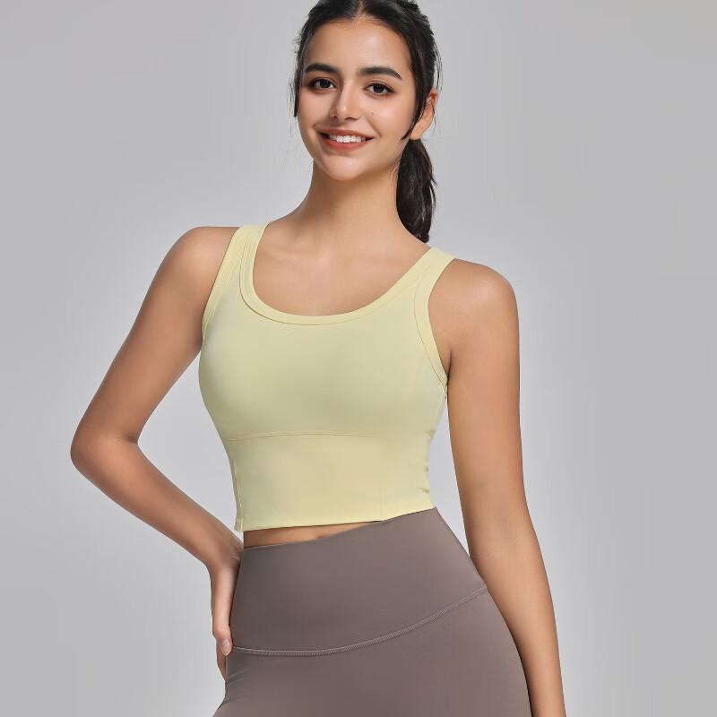 This women's integrated yoga sports vest is perfect for fitness and active lifestyles. Crafted from comfortable nylon fabric, it offers flexibility and support for various workouts. Available in a stylish washed yellow.