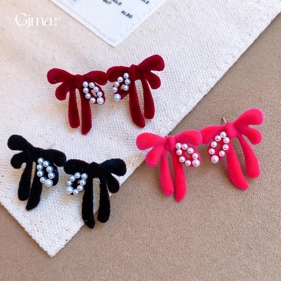 Sweet Flocking Bow Pearl Stud Earrings Autumn and Winter Vintage Versatile Earrings Earrings