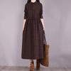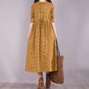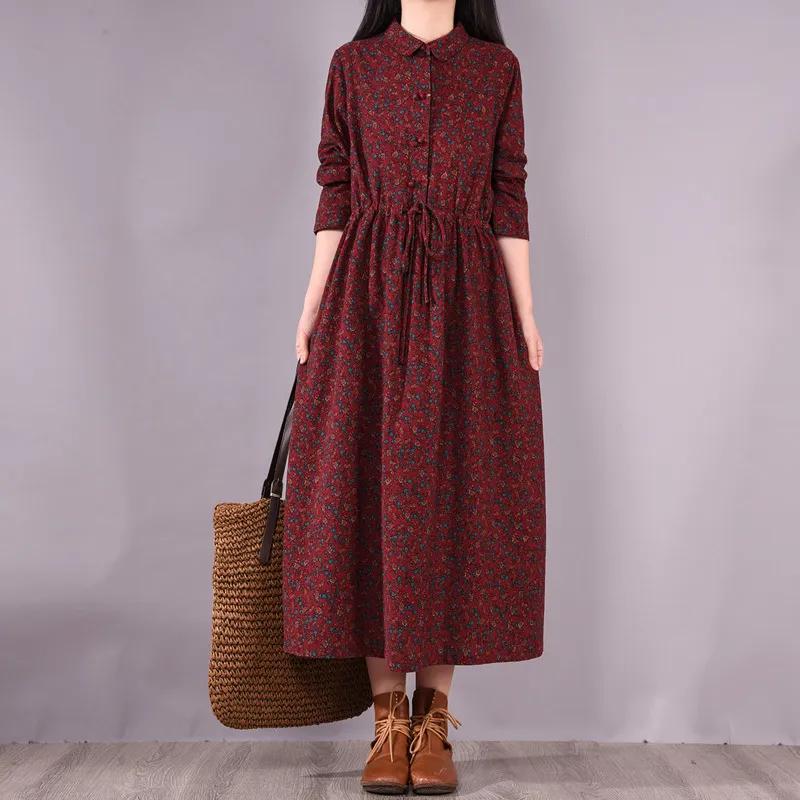 Spring and Autumn Retro Floral Cotton Linen A-Line Long Waist-Cinching Belted Long Sleeves Turn-down Collar Large Size Women's Dress