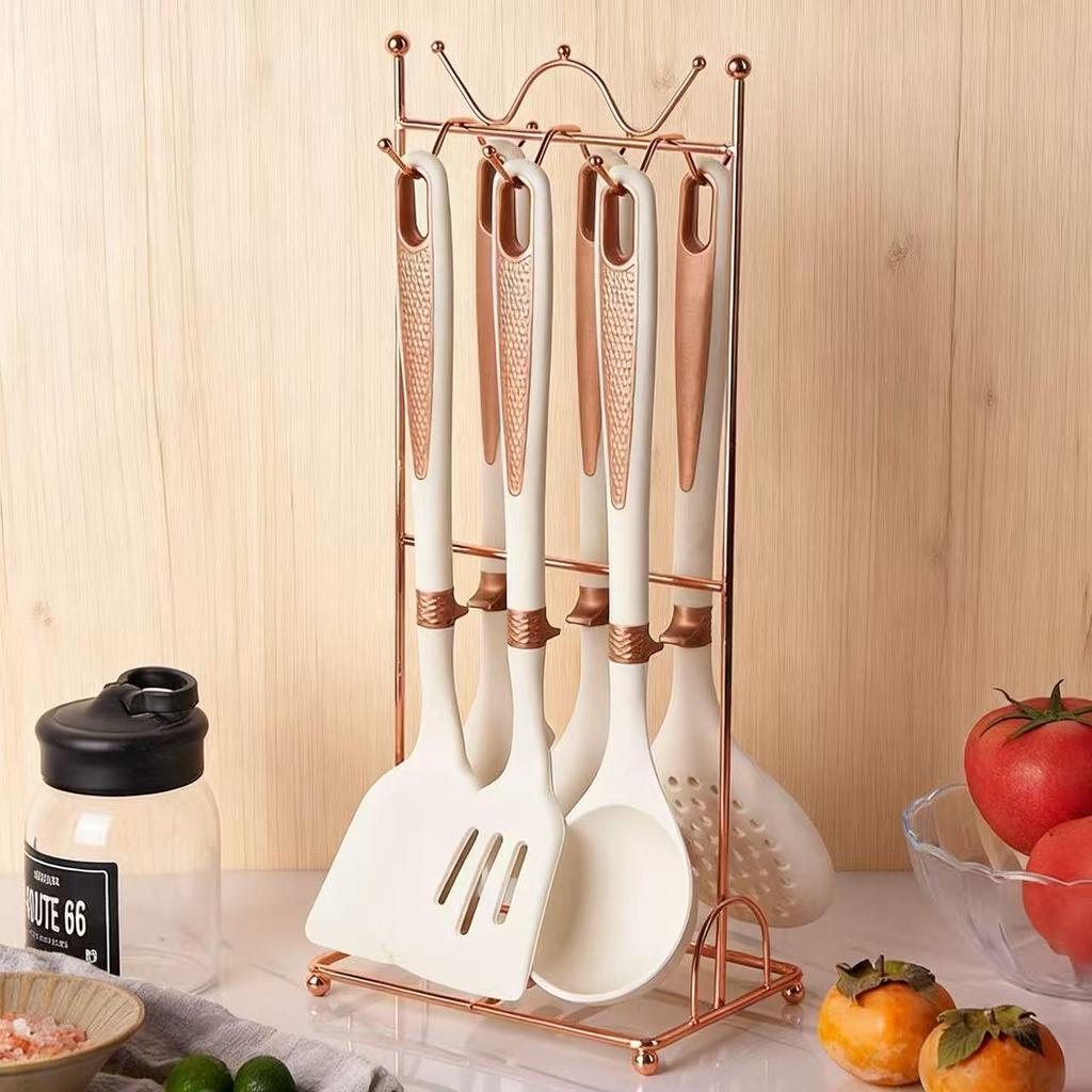 Silicone 7-Piece Kitchen Utensil Set with Storage Rack: Heat-Resistant, Non-Stick Spatula, Slotted Spoon, Ladle.