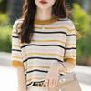 All-cotton Round Neck Relaxed Fit Simple and Versatile Temperament Short-sleeved T-shirt Latest Style Literary Striped Knitted T-shirt Top for Women