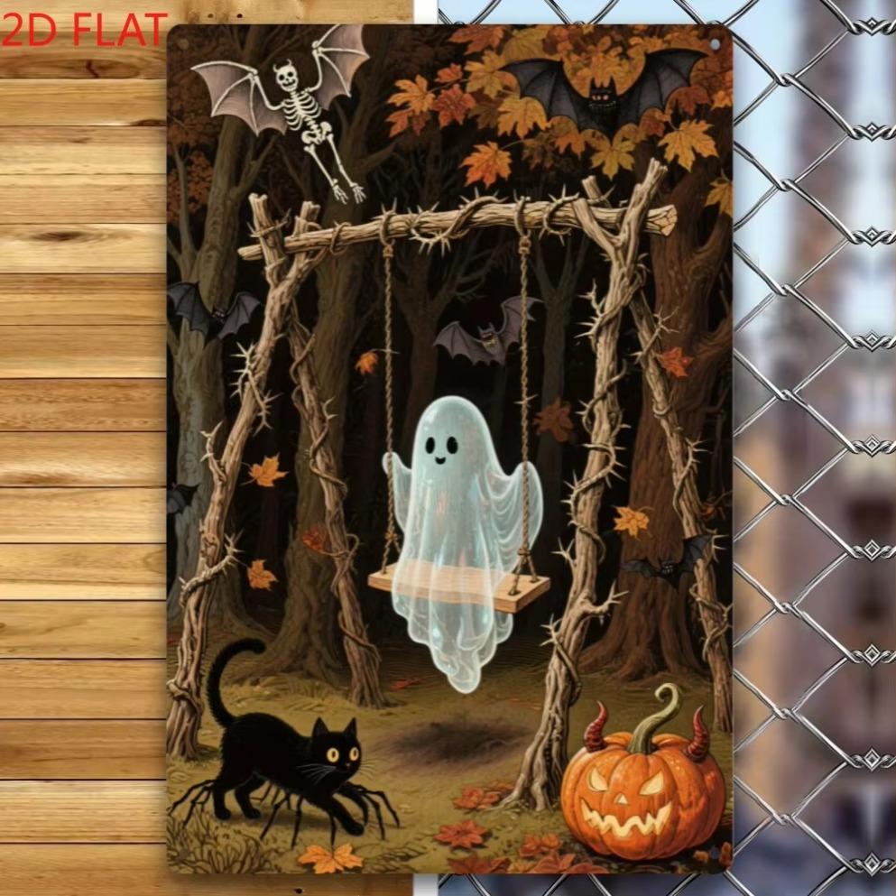 1pc 2D Flat Vintage Halloween Iron Sign Spooky GhostsBatsPumpkinsHaunted House Decor Ideal for Living RoomGarden