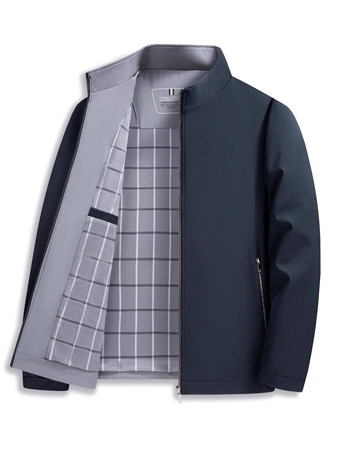 This men's jacket is designed for the modern middle-aged and elderly gentleman who values both style and comfort. With a stand collar and a sleek zipper closure, it offers a sophisticated look suitable for business casual settings. The jacket features a medium outerwear thickness, making it an ideal choice for various weather conditions. Crafted from high-quality polyester material, it ensures durability and comfort. The solid color pattern adds to its timeless appeal, while the long sleeves provide additional coverage and warmth. Perfect for adding a touch of elegance to any casual or semi-formal outfit.