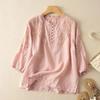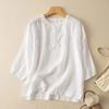 Women's Vintage Boho Cotton-Linen Embroidered Three-Quarter Sleeve Shirt Mom's Summer Solid-Color Top
