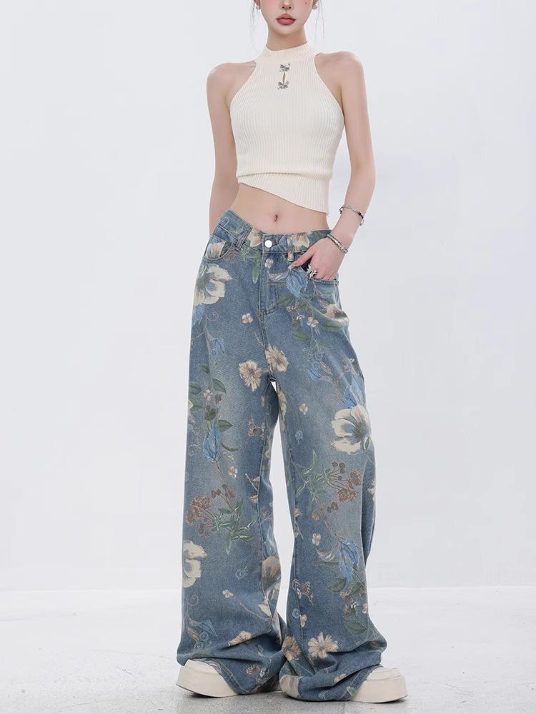 Printed Denim Jeans, Loose Fit, Versatile Wide-leg Pants
