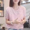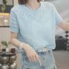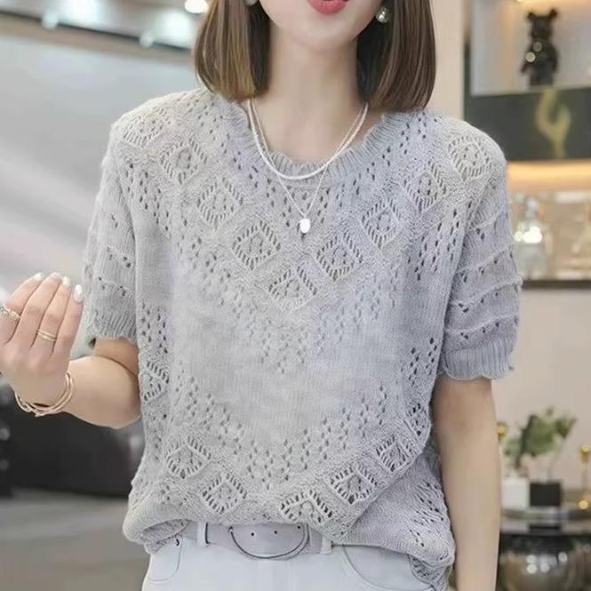 Spring Summer Hook and Flower Hollow Short Sleeved Knitted Sweater T-shirt for Women Round Neck Thin Loose Top