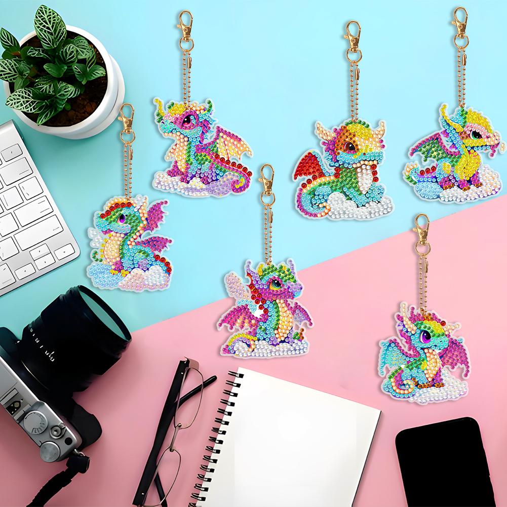 5/6/7PCS Rhinestone Painting Keychain Pendant Diamond Art Keyring Rose Grey Dragon Cute Kitten Envelope Flowers Mandala