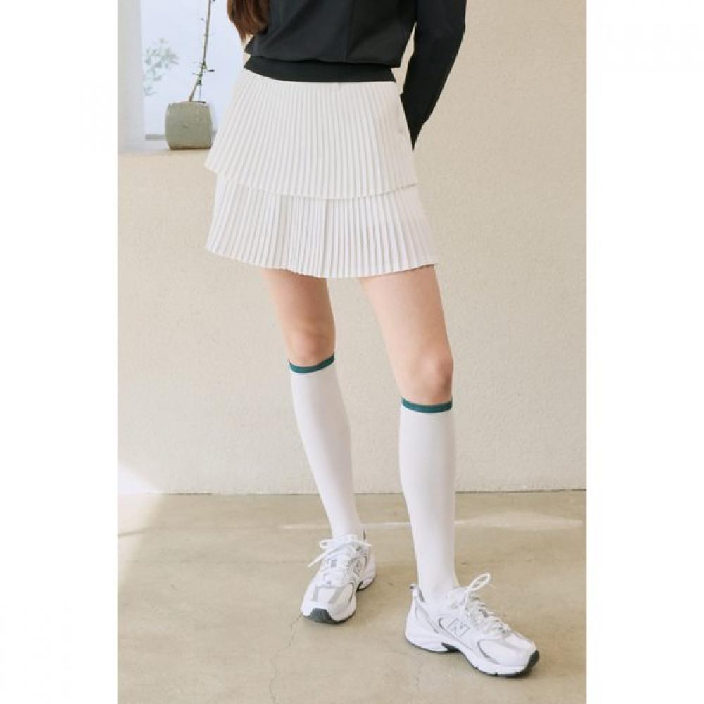 The GOEXO Heart Logo Double Pleated Skirt (White) features a standout double pleat detail in a mini skirt design. Made from polyester material, it is light and cool for summer wearing, with an A-line silhouette and gently swaying pleats. It is evaluated as a versatile item suitable for all three seasons as women's golf skirt.