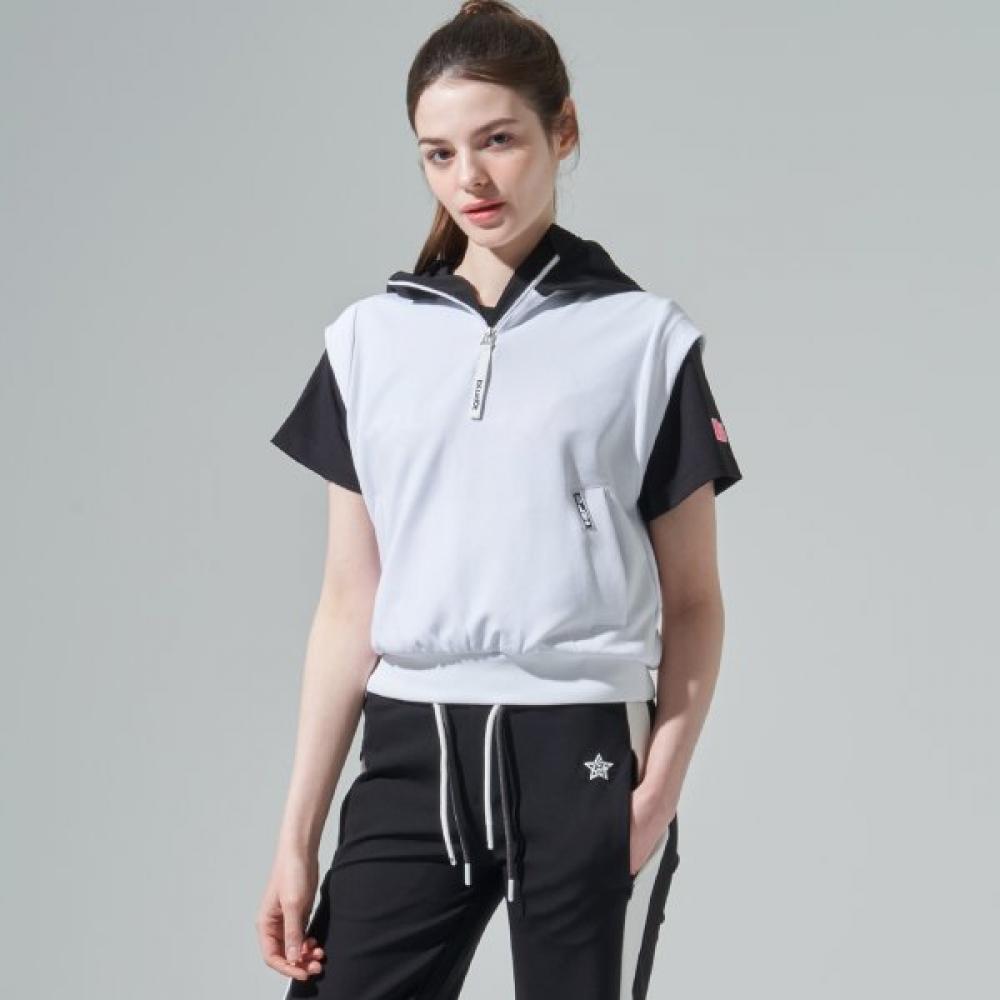 The BLUDOT Volume Hood Vest_WH is a women's golf vest suitable for the S/S season. Made from soft-touch double fabric, it boasts outstanding volume and a plush feel. The mix of rayon and moisture-absorbing, quick-drying polyester offers exceptional stretchability for a comfortable fit. The hood design adds extra comfort and is suitable for various sports activities.