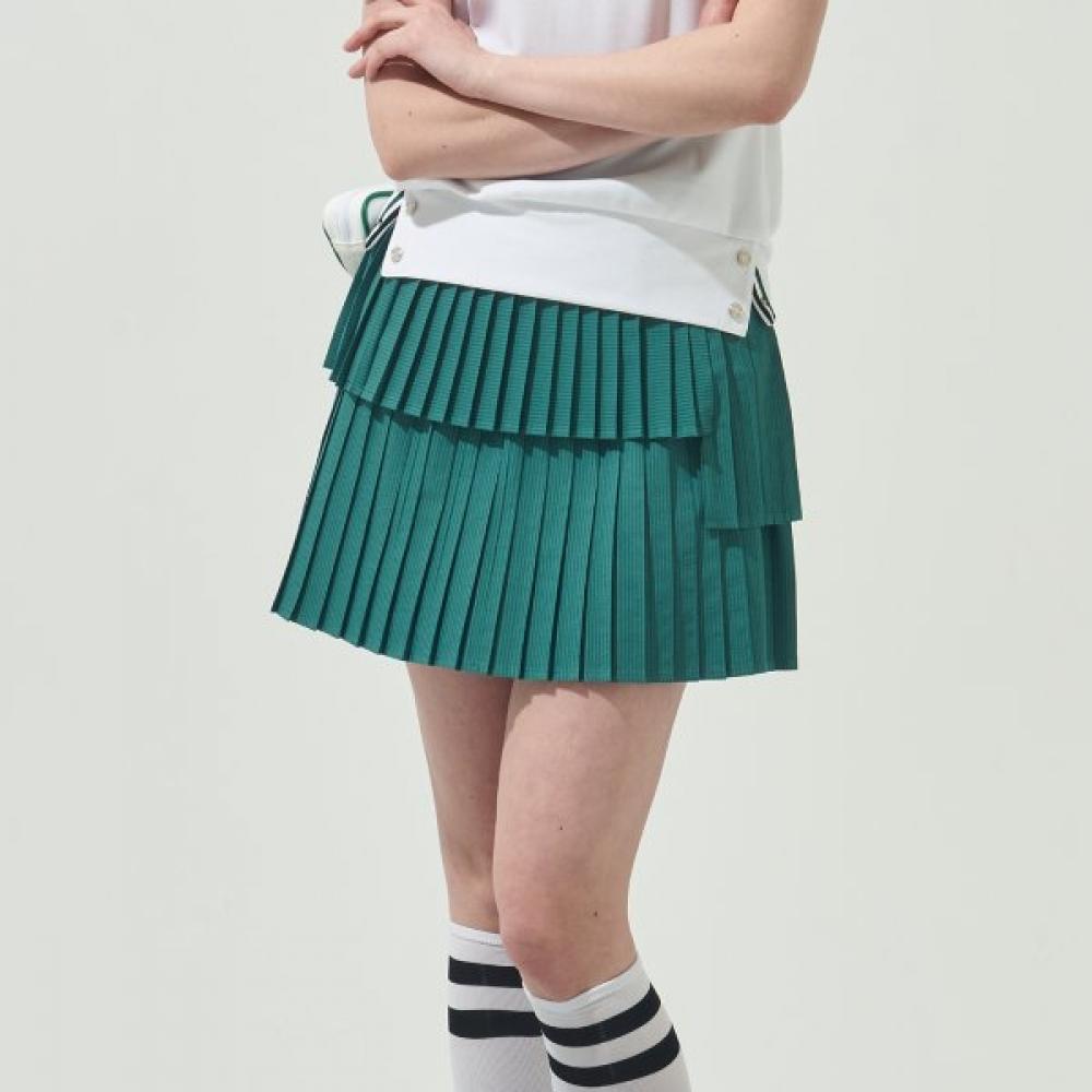 The BLUDOT Layered Pleats Skirt_GN features a layered pleats design made from striped pattern shear seer sucker fabric. This lightweight material ensures comfortable play regardless of the weather and keeps you cool even in the hot summer.