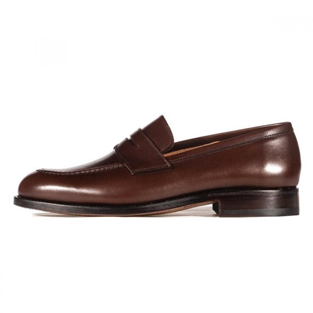 The Yanko Casares Boxcalf Marron is a men's penny loafer made in Spain. This loafer is crafted from natural boxcalf leather and features a U-tip style and plain toe design that exudes luxury. With a slip-on type that requires no laces, it offers a comfortable fit suitable for everyday wear.