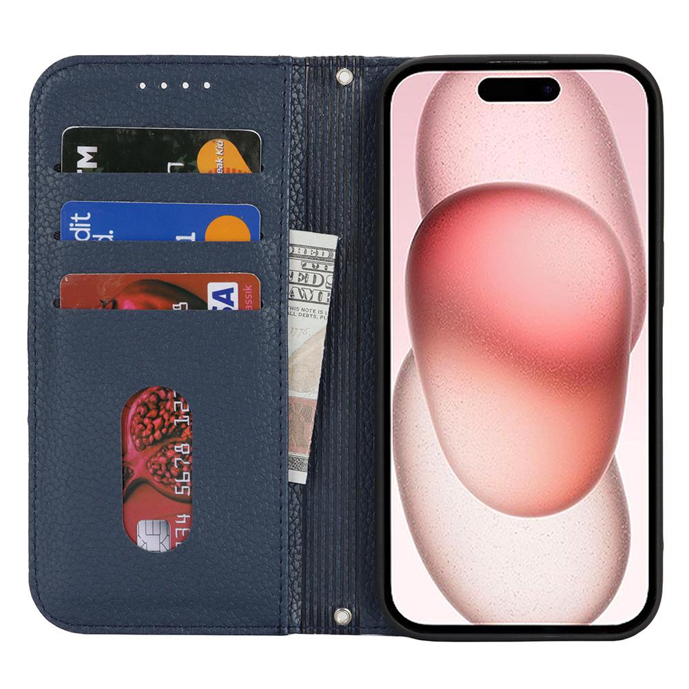 Stand Case for iPhone 15 Litchi Texture Leather Flip Phone Cover with Strap/Wallet