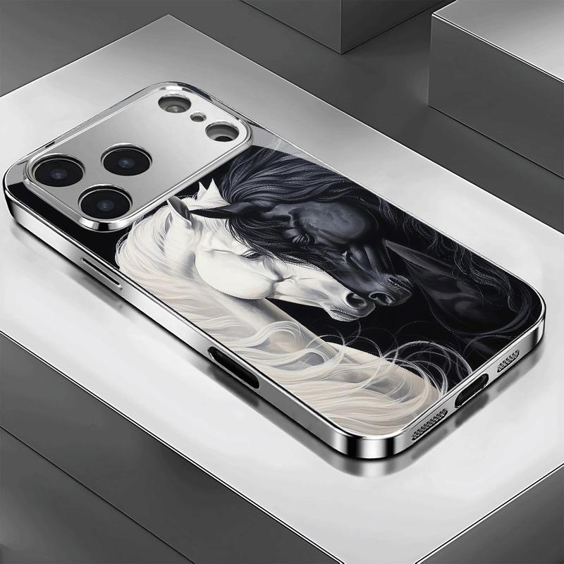 Black White Horse Pattern Tempered Glass Electroplated Phone Case For iPhone 17 16 15 14 13 12 11 Pro Max 16 Plus 17 Air Cover